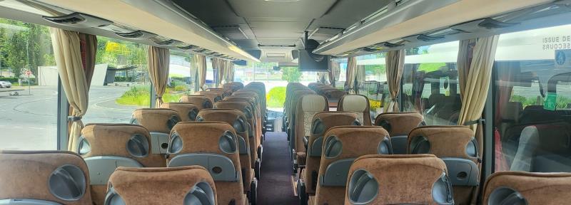 ABS - ralentisseur - chauffage autonome - sièges inclinables - climatisation - double vitrage - radio - video ou/et DVD - frigo - WC - cruise control - ceintures de sécurité |